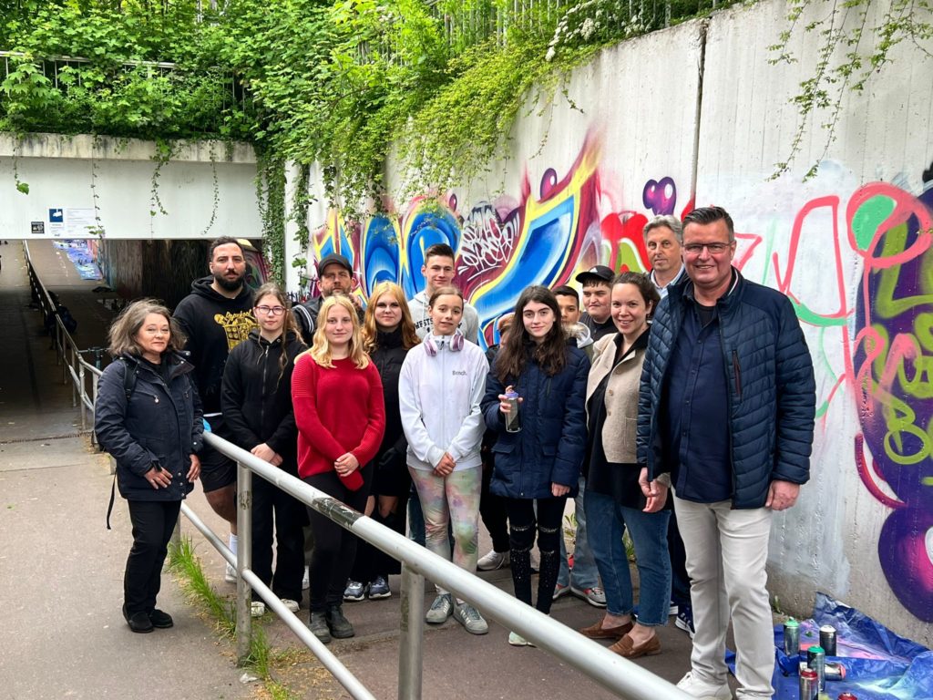Vor den fast fertigen Kunstwerken in der Unterführung: Von rechts: Thomas Mahlmann (zdi-Zentrum Lippe.MINT), dritter von rechts: Jörg Pohlmann (Plantag Coatings GmbH), Dorothee Kriener (Schulleitung Albert-Schweitzer-Schule), von links: Anita Millard (Albert-Schweitzer-Schule), Monib Sadat (Rapschool NRW), vierter von rechts: Daniel Schneider (Rapschool NRW), mit den Schülerinnen und Schülern der Albert-Schweitzer-Schule.
