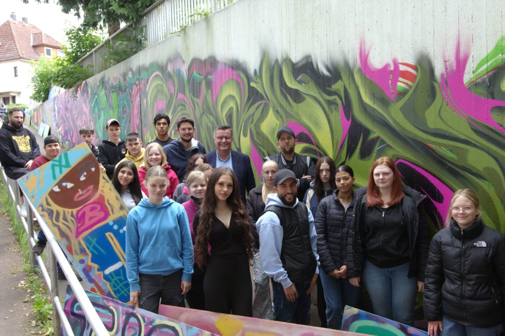 Hier wird vor Ort die Arbeit aus dem Graffitiprojekt präsentiert: Mittlere Reihe, fünfter von rechts: Daniel Schneider (Rapschool NRW), siebter von rechts: Thomas Mahlmann (zdi-Zentrum Lippe.MINT), achter von rechts: Oliver Laschke (Gustav-Heinemann-Schule) vorne: Uzuk Ufun (Rapschool NRW), hinten links: Monib Sadat (Rapschool NRW) mit den stolzen Schülerinnen und Schülern der Gustav-Heinemann-Schule.